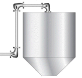 The Figure to the left depicts three Wear-Bow installations on a silo. Note how the orientation of the Wear-Bow can vary and that the space required is far less that what would be required for a standard radius elbow. This adds to the versatility and overall use of the Wear-Bow since it can be used in a greater number of applications. | |
